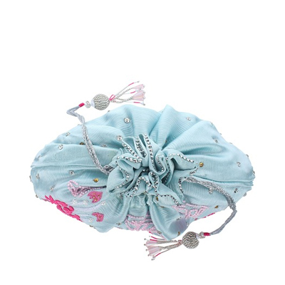 Blue and pink embroidered embroidered potli clutches 1 main compartment with drawstring closure